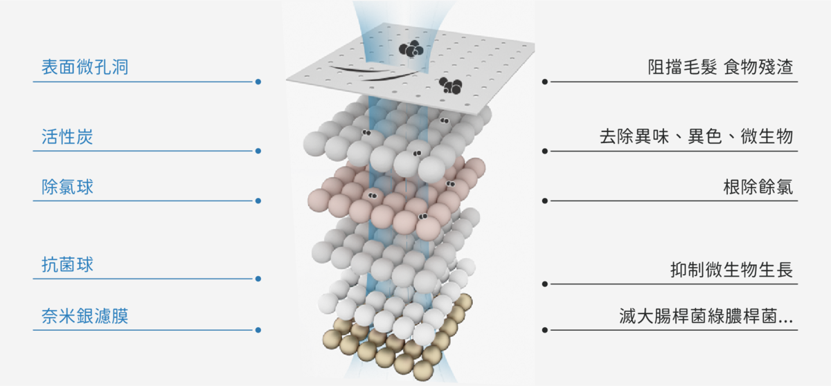 ❶ 初層 - 飲水表盤深淺設計 > ❷ 第二層 - 過濾毛髮、灰塵、殘渣、餘氯 > ❸ 第三層 - 乾淨飲水集中區