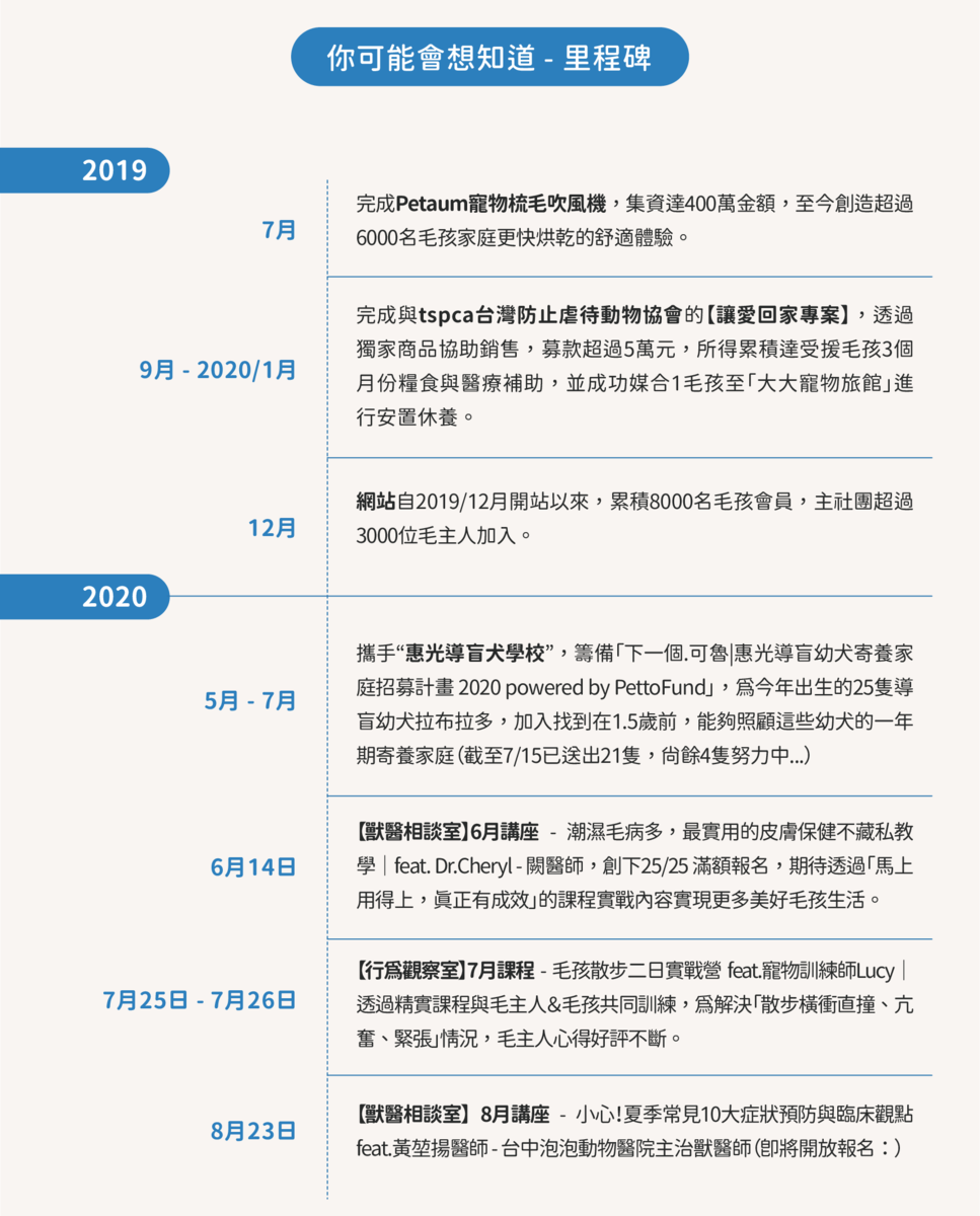 你好,我們是PettoFund - 來自台灣,擁有8喵4汪的毛主人團隊。 👪 🐶 😻從創業第一天,我們便致力於透過群眾力量,實現更多毛孩家庭美好生活。