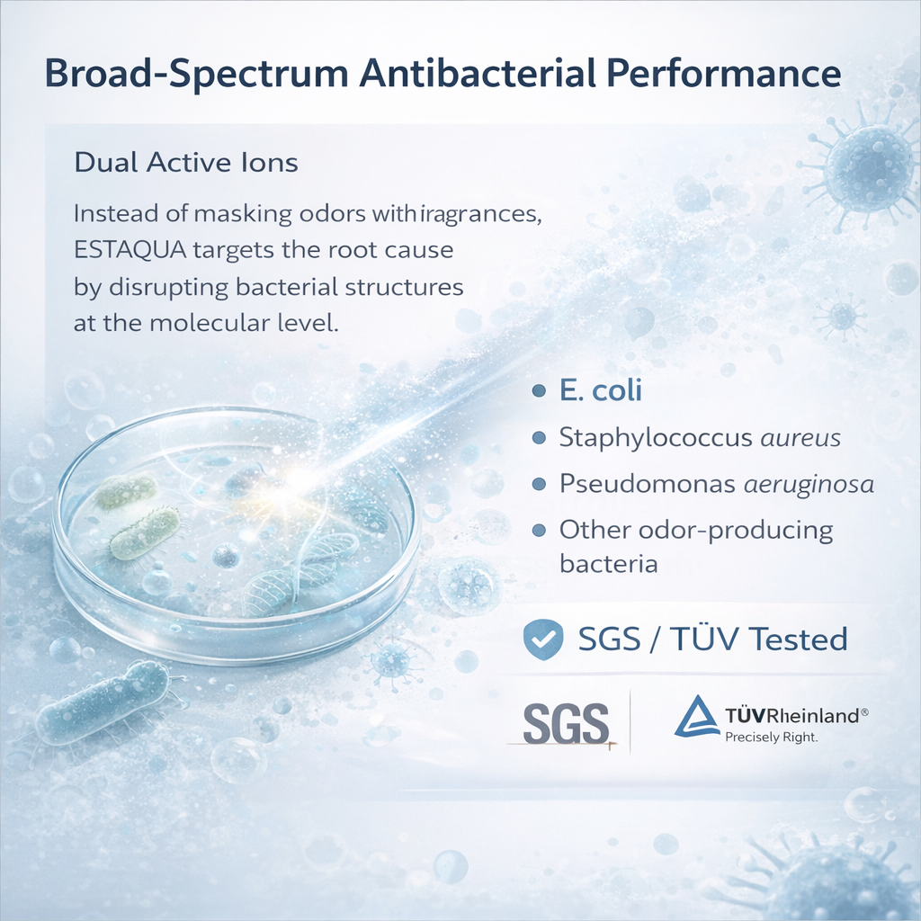 ESTAQUA Dual-Ion Pet Spray 通過 SGS / TÜV 檢測,具備廣譜抗菌表現,可有效對抗多種常見異味來源微生物,如大腸桿菌(E. coli)、金黃色葡萄球菌(Staphylococcus aureus)、綠膿桿菌(Pseudomonas aeruginosa)等。針對貓砂盆、家具、地板與室內空氣等日常場景,提供兼具除臭與抑菌的專業守護。