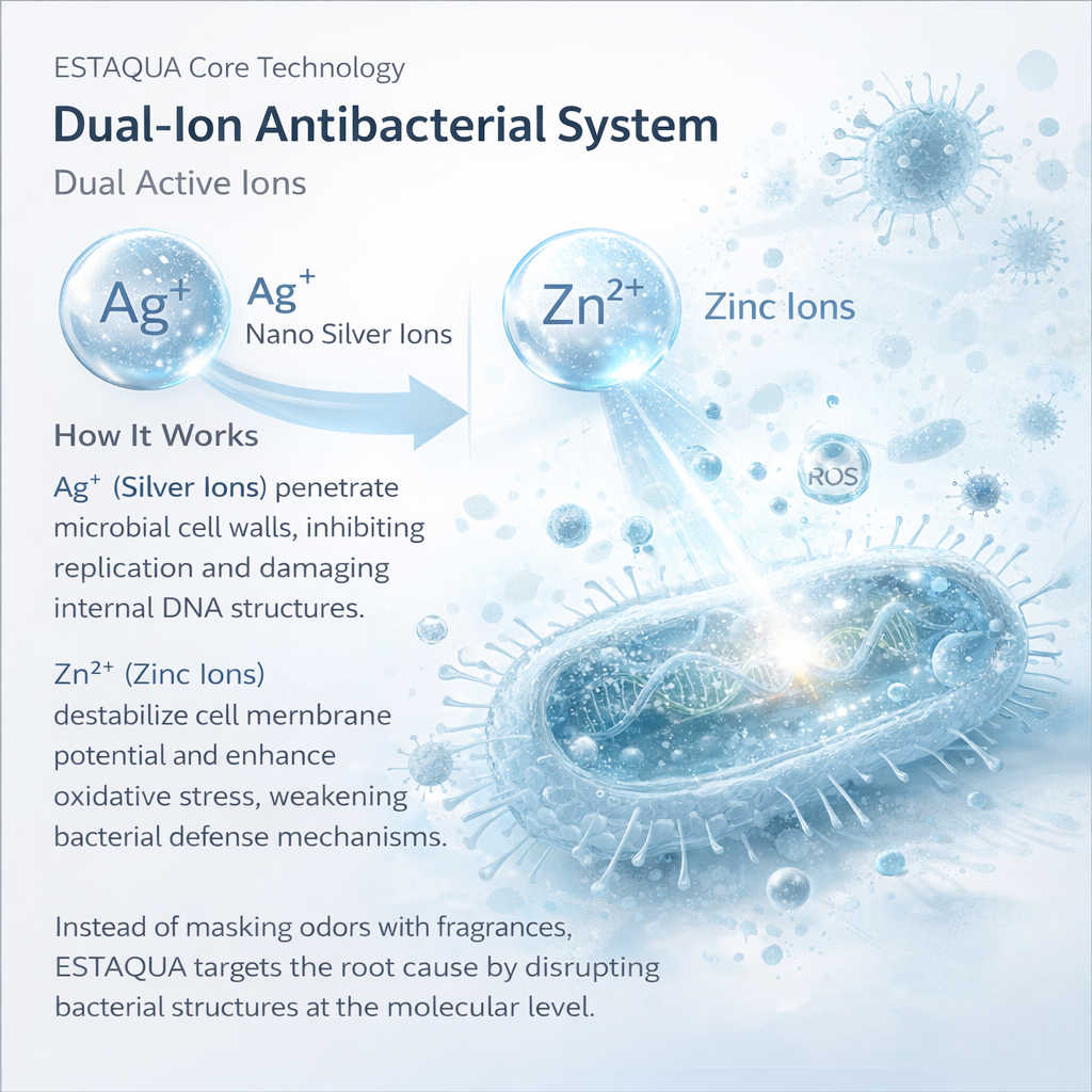 Ag⁺ 在潮濕環境中緩釋,結合 Zn²⁺ 的膜電位破壞作用,能持續 14 天以上 抑制細菌與異味滋生。