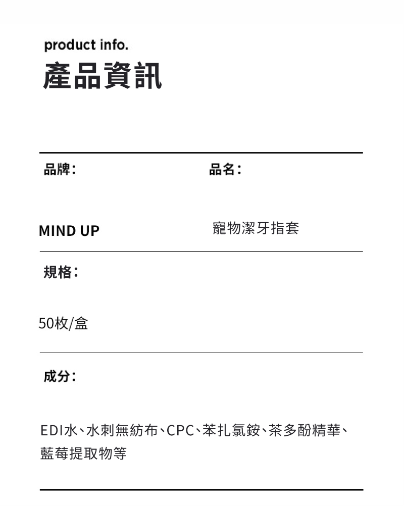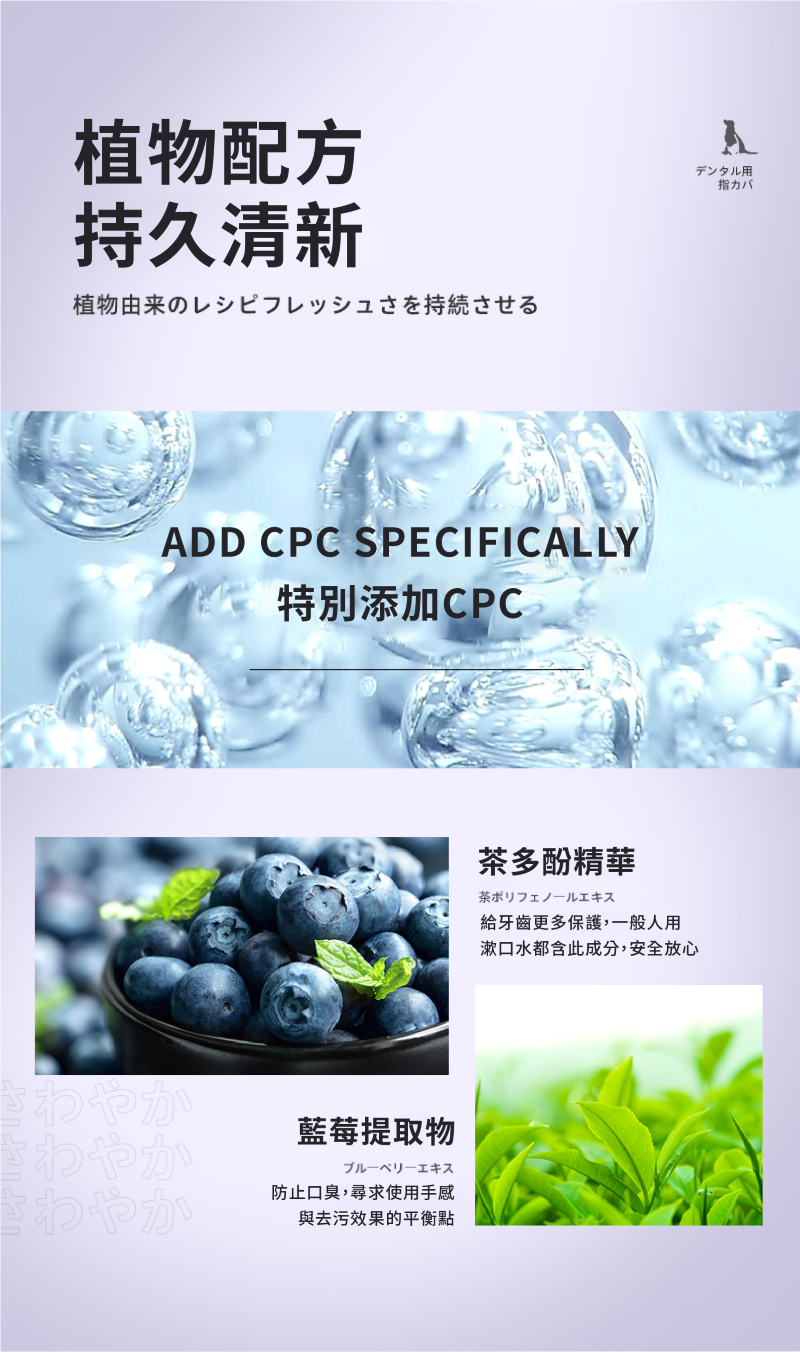 產品成分:EDI超純水、水刺不織布、CPC、苯扎氯胺、茶多酚精華、藍莓萃取、苯氧乙醇