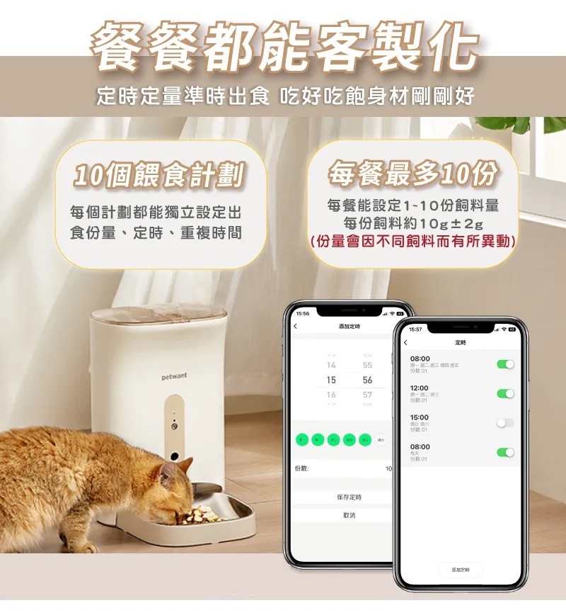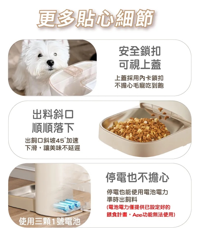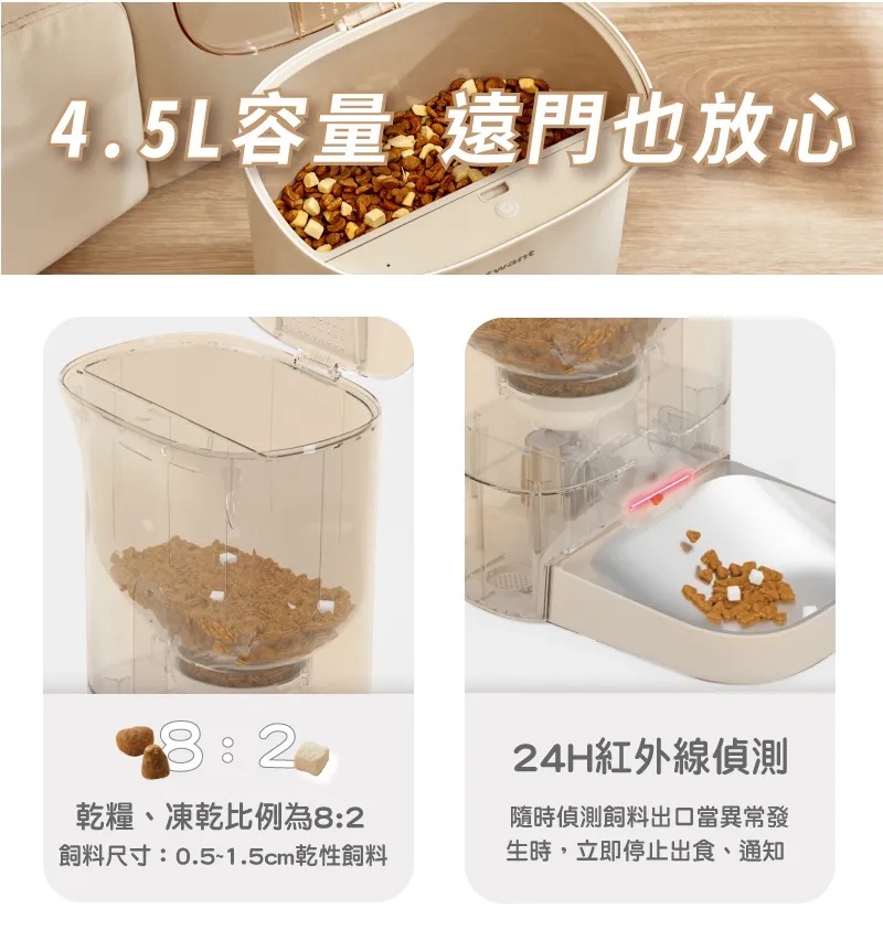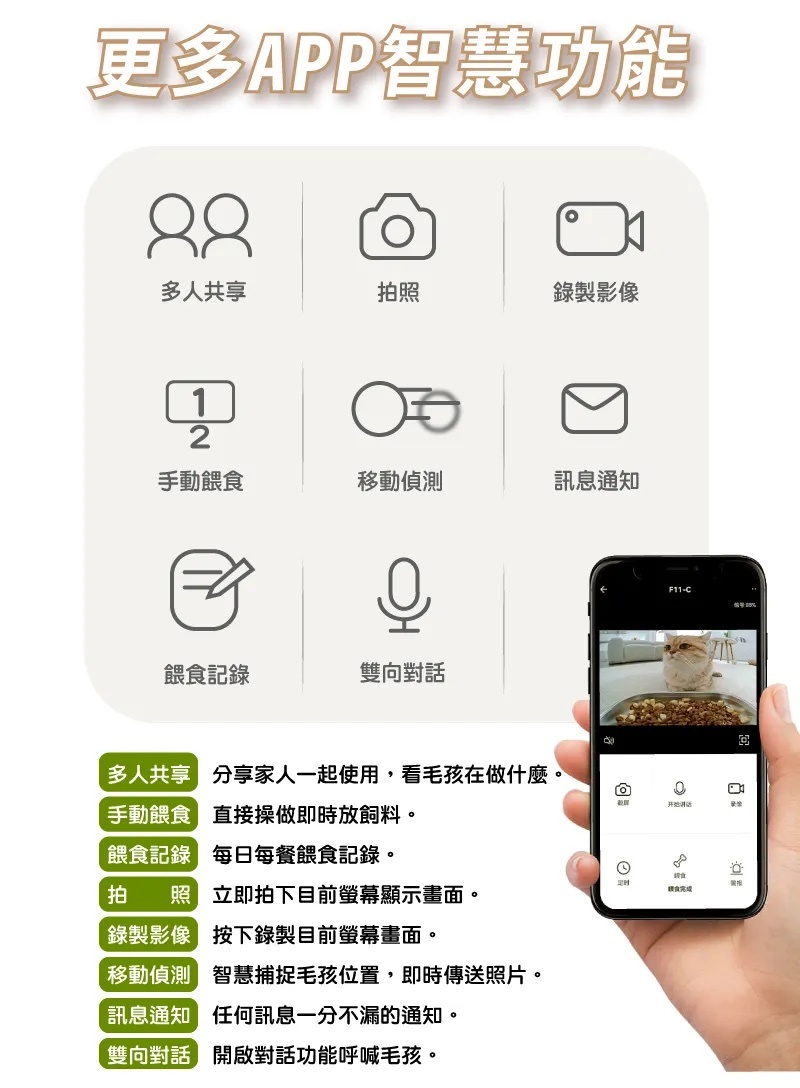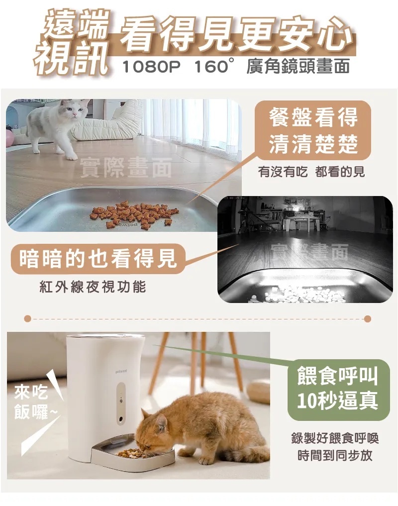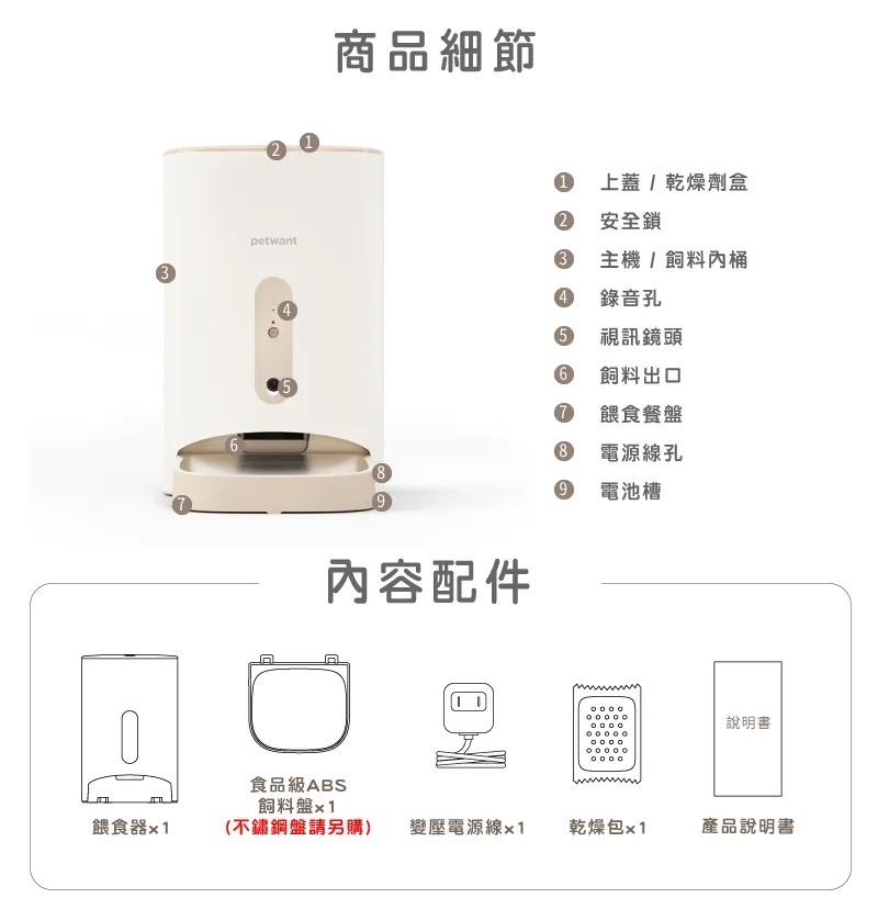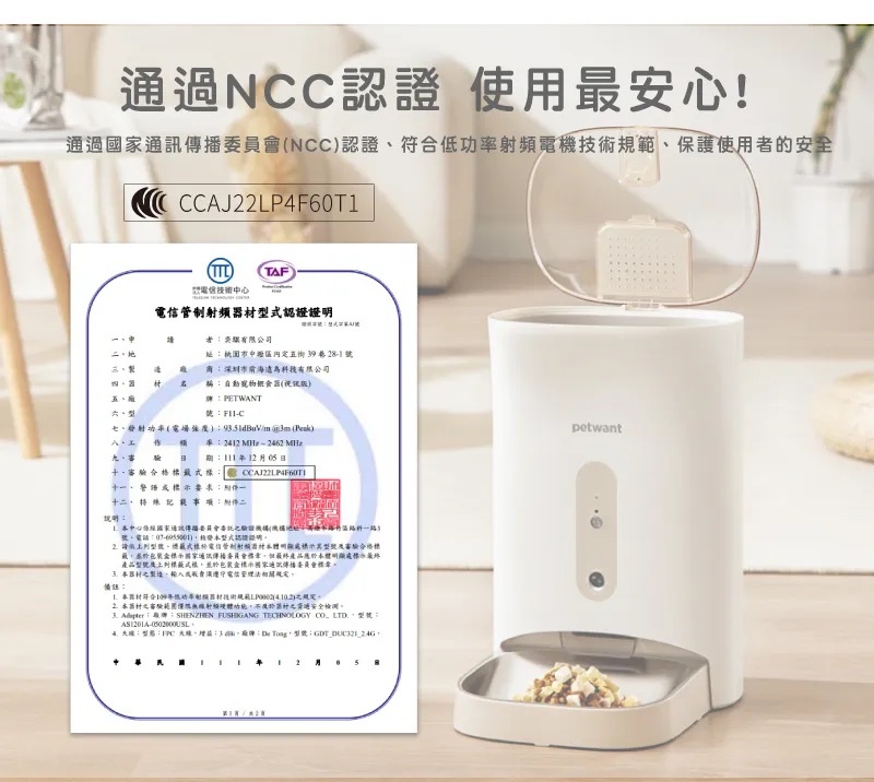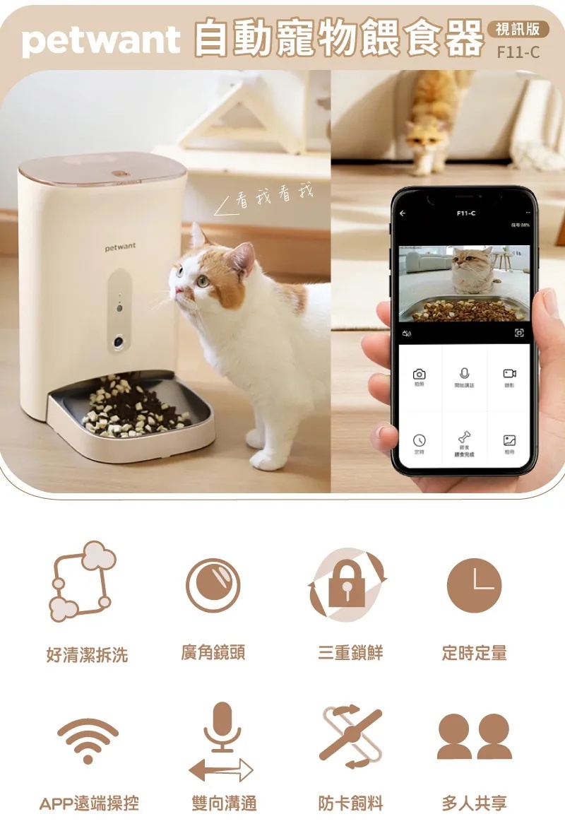 產品名稱:自動寵物餵食器(視訊版)型號:F11-C網路需求:使用2.4G網路(如為5G須先降為2.4G,成功連線後可調回5G)額定電壓:5V/2A消耗功率:2.5W電池:三顆一號電池(限用鹼性電池)無線連接:WIFI 2.4G飼料容量:4.5L飼料類型:5-15mm(規則型乾性飼料)使用環境溫度:5-50度材質:ABS產品淨重:2.6kg產品尺寸:31.7*24*37cm產地:中國國際條碼:4710631261478NCC許可字號:CCAJ22LP4F60T1注意:此商品屬於衛生用品,使用後無法做退換貨處理!收到貨品未使用,第一時間反應商品有任何瑕疵問題,才允退換貨處理!- 保固期限:1年 - 保固範圍:新品瑕疵 非人為損壞故障,主機保固一年,需附發票或購買證明。
